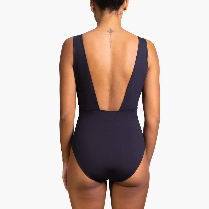 Le maillot de bain menstruel Swim est décolleté en V. Il intègre un assemblage de protection très fin qui ne gonfle pas dans l’eau.